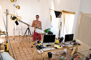 Šodien, naudas trūkuma mākti, filmējām reklāmu aizkariem - tādiem uzrullējamiem uz augšu, kādus īsta mexikāņu mamma nemaz nav redzējusi savā miestā. TV jā - tur jā. Tur arī visi tie dīvainie trenažieri, lai nodzītu kolas un čipsīšu riepu.